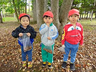| みんな到着するとどんぐり拾いに夢中です 袋に入れて「ポーズ!」 |