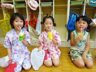 | 今日は待ちに待った「夏まつり」の日です まずは〜 4、5歳児の「ジュース屋さん」です |