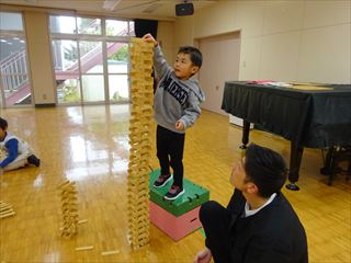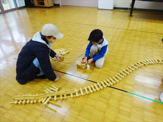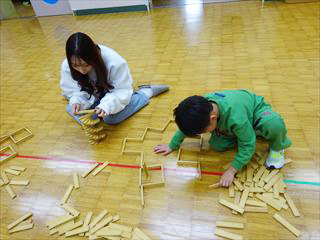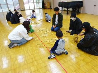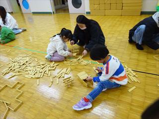 | すみれ組さんとさくら組さんはホールでカプラで遊びました 高くしたり〜 長くしたり〜 |