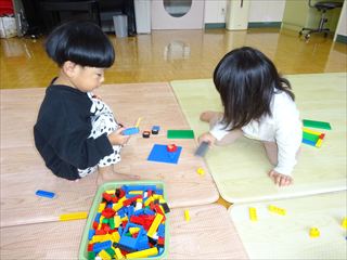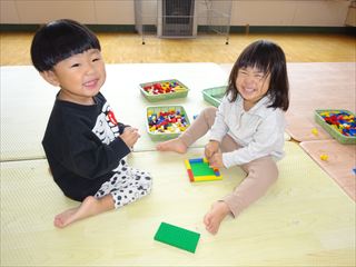 | たんぽぽ組さんは小さいレゴブロックで遊びました 何を作ろうかな? 仲良く遊びました |